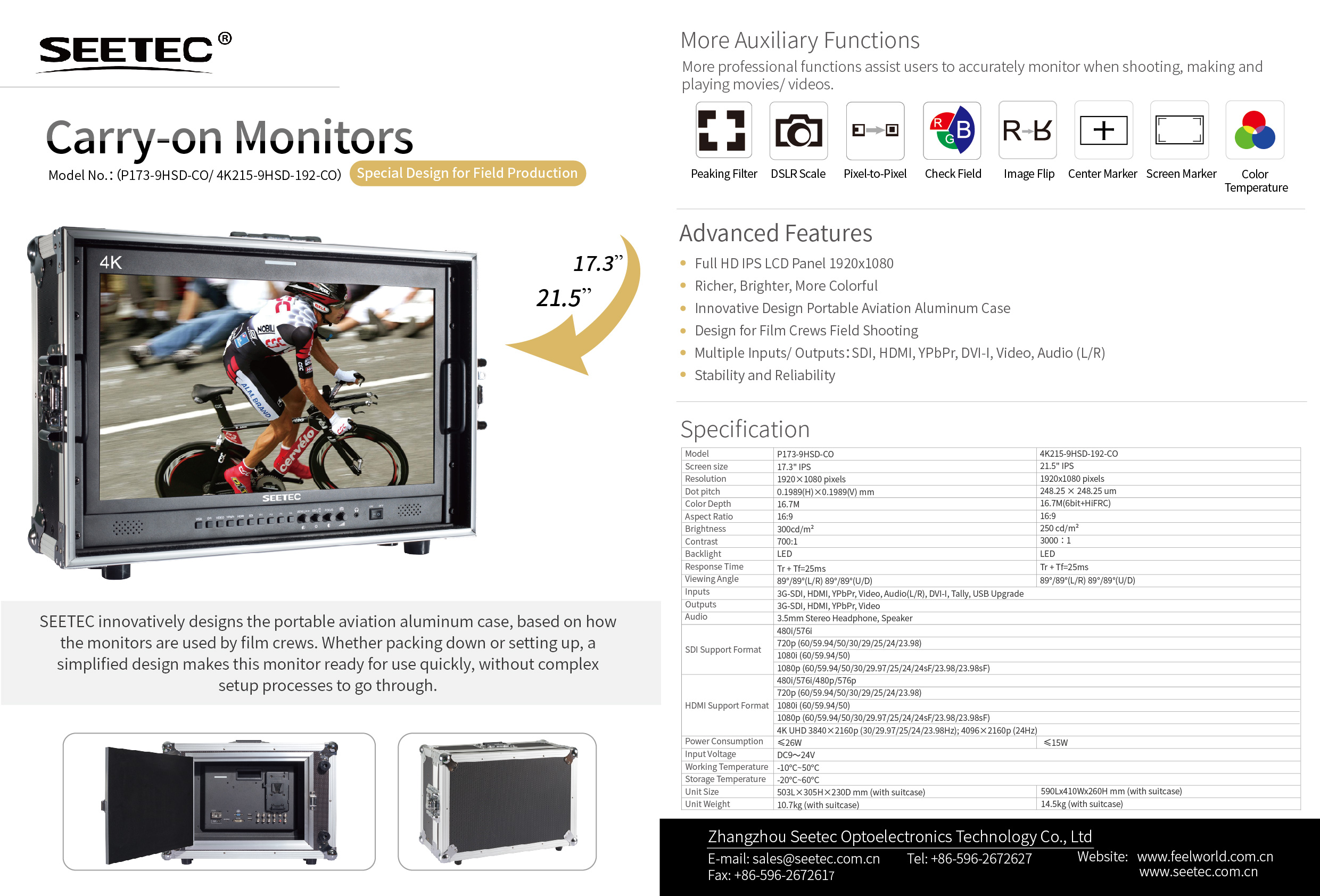 P173-9HSD-CO not only set up four "F key" for peaking focus asist, check field, camera mode function, pixel to pixel, Center Marker, Safe Marker, Image Flip and so on, reserves the knob for professional users. Double functions and knob type coding switch are SEETEC's exclusive technology feature, which will bring you more convenient and rapid operate feeling.