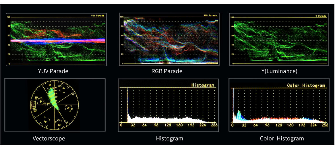 When you need to analyze image quality more accurately than simply looking at the picture then use P133-9DSW's built in waveform monitoring! You can view two independent sources simultaneously and conveniently switch between monitoring or scope views whenever you need! Choose from Waveform (RGB parade, YUV parade, Y parade), Vectorscope, Histogram and Audio Level Displays, and get broadcast accurate waveform monitoring that shows everything you need to know technically about your video and audio signals. P133-9DSW removes the need for separate expensive scopes!