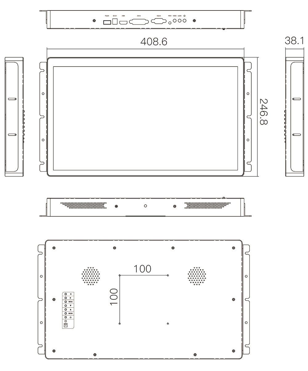支持嵌入式、壁掛式等多種安裝方式,方便在各類行業中靈活應用。 (配送的掛耳可滿足您嵌入式安裝的需求,標準螺絲孔距VESA 100x100mm可支持壁掛式安裝)