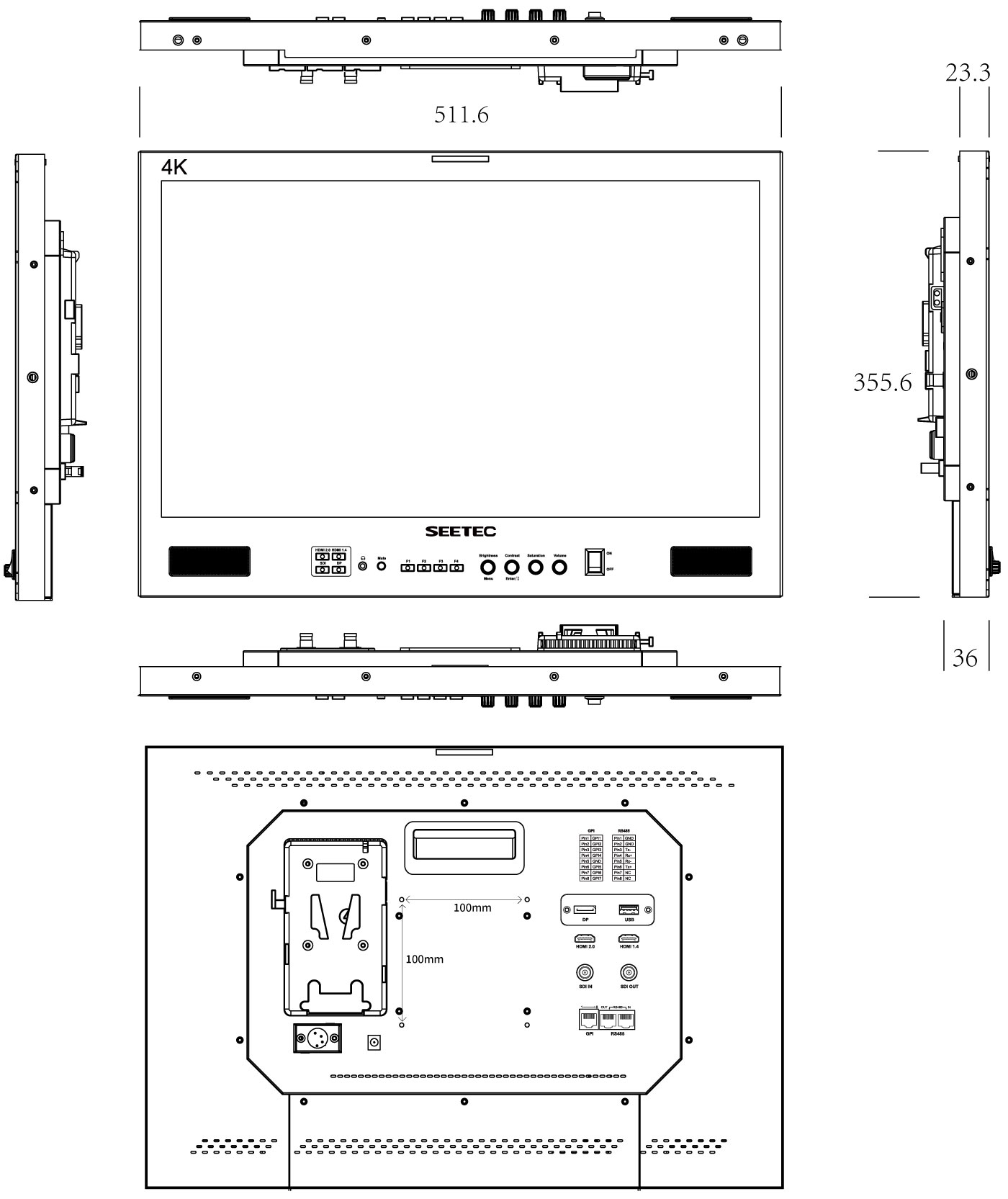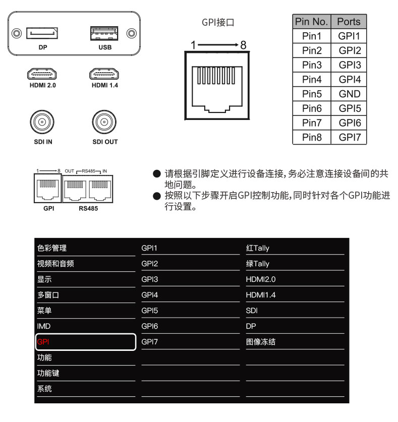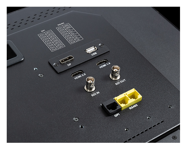 2. 3G-SDI, HDMI2.0, HDMI1.4, RS485, GPI, DP (DisplayPort) 輸入