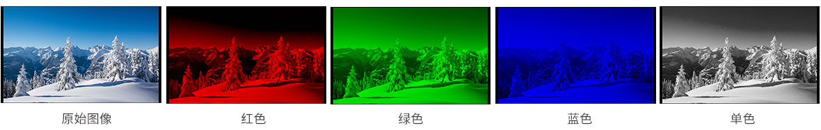 單色顯示用于輔助調整攝像機色彩設置。在單色顯示模式下,用戶可以切換用紅色、綠色、藍色或者黑白來驅動像素點,在此模式下可以更快更準確的調整畫面的色調飽和度。