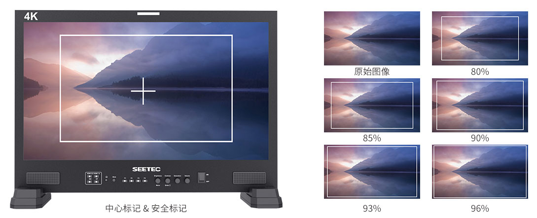 防止播放時掃描溢出,導致不該被切的畫面而被切掉。監視器設有多種畫幅安全框標記( 80%, 85%, 90%, 93%, 96%) 和拍攝標記線和十字中心線。保障穩定可靠的拍攝高效進行,滿足多樣化的后期裁剪需求。用戶可以根據不同拍攝背景色調靈活選擇標記線顏色(紅色, 綠色, 藍色, 黑色, 白色)。