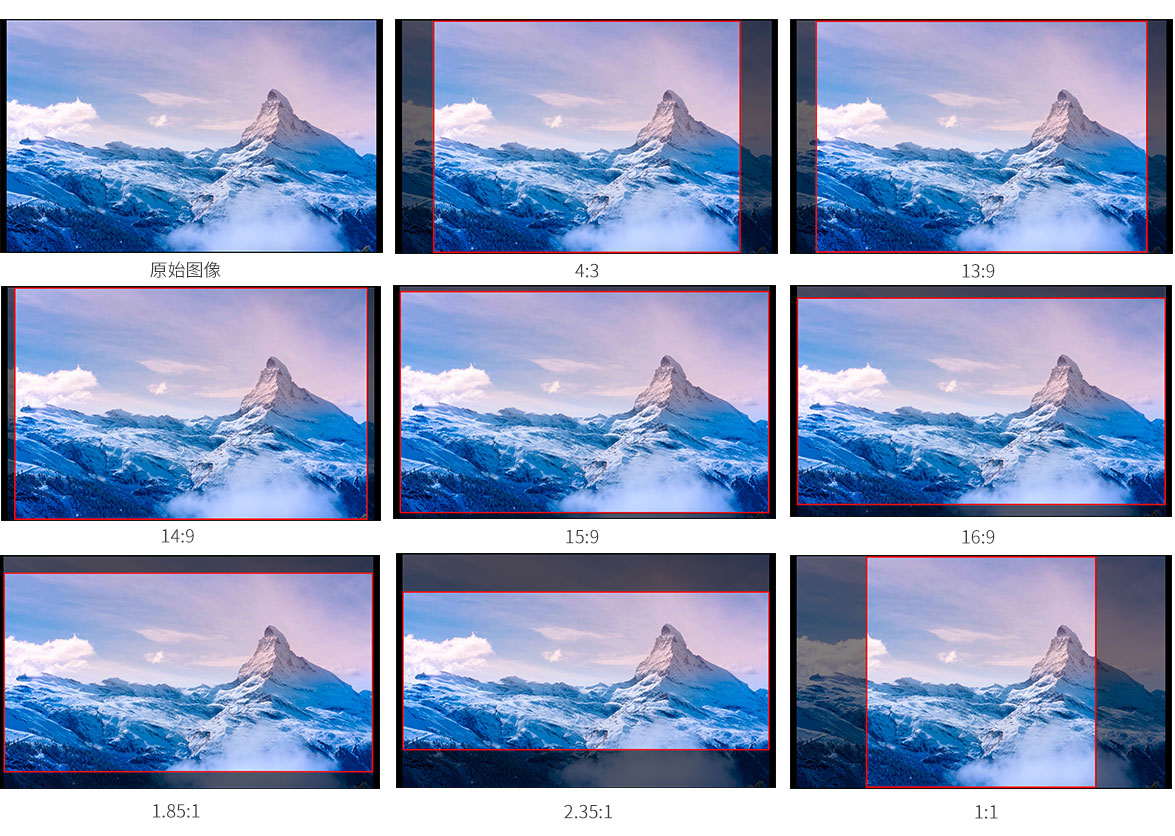 設有多種畫幅比例導視框(4:3, 13:9, 14:9, 15:9, 16:9, 1.85:1, 2.35:1, 1:1);比例標記線有多種顏色可選(紅色、綠色、藍色、白色、黑色);畫幅消隱區有6種模式可選,由0-6全透明、半透明至全黑,,標記線寬度可根據需要調整(1-7可調)。