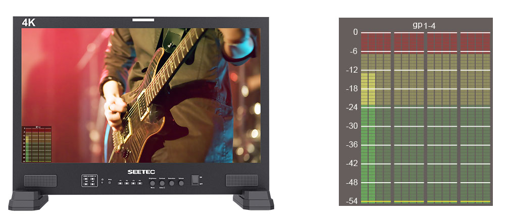監視器可以解嵌來自SDI和HDMI的音頻,您可任選2路音頻通過揚聲器或3.5mm口輸出。 在SDI音頻下,支持最大16路音柱顯示,您可以選擇僅顯示2/4/8個通道或者完整的16個通道。在HDMI音頻下,僅支持2路音柱顯示。