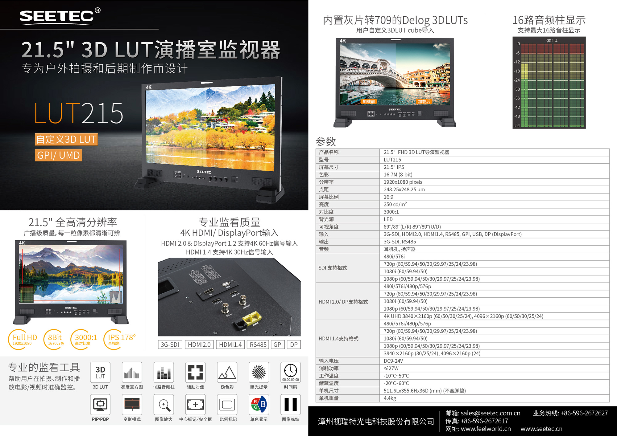 SEETEC LUT215一款應用廣泛的高品質監視器,從廣電機構到移動式現場制作,甚至是電影外景拍攝制作都能勝任!配備了3G-SDI、HDMI2.0、HDMI1.4、RS485、GPI和DP接口,適用于不同信號格式傳輸。