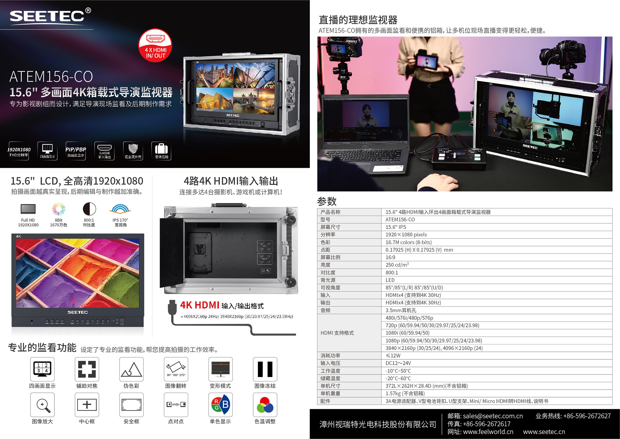 SEETEC ATEM156-CO根據前期拍攝和后期制作的實際需要,設定了專業的監看功能,幫您提高拍攝的工作效率。配備四個4K HDMI輸入,支持四畫面、雙畫面、單畫面監視功能,讓您在任何位置都可以進行多機位監看!包含各種聚焦檢查功能,例如峰值對焦、偽色彩、點對點,可幫助獲得清晰的圖像。包含取景功能,例如中心標記、安全標記、網格標記,用來防止在直播過程中切割屏幕,在直播過程中為其他功能留出正確的空間。還包含了圖像放大、單色顯示、圖像凍結、色溫調整等功能。