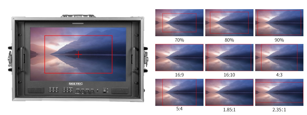 防止播放時掃描溢出,導致不該被切的畫面而被切掉。監視器設有多種畫幅安全框標記( 70%、80%、90%、16:9、16:10、4:3、5:4、1.85:1、2.35:1、自定義) 和拍攝標記線和十字中心線。保障穩定可靠的拍攝高效進行,滿足多樣化的后期裁剪需求。用戶可以根據不同拍攝背景色調靈活選擇標記線顏色(黃色、青色、紫色、紅色, 綠色, 藍色, 黑色, 白色)。