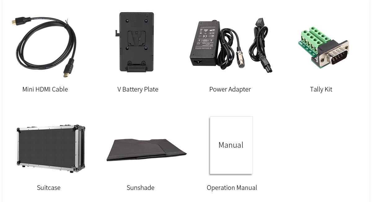 The monitor an be powered by DC adapter or lithium battery. For power adapter, you can connect XLR power connector; for battery, you can mount it on V-mount battery plate (standard) or Anton Bauer battery plate (optional).
