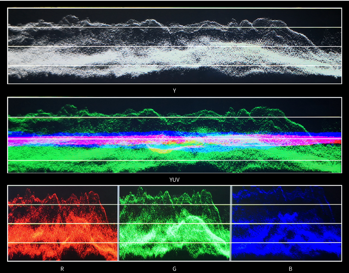 波形圖是一種精確的顯示和觀測視頻畫面亮度級別的輔助圖形,將視頻上每一列像素點的亮度值和分布情況統(tǒng)計出來,支持YUV、RGB、灰度三種波形
